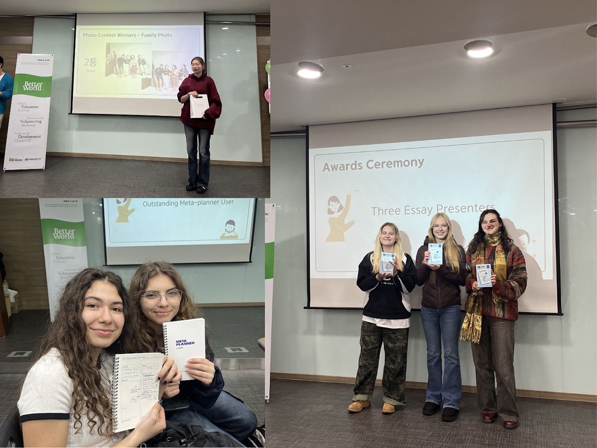 평가회 이후에는 함께 점심을 먹고, 이어 학생들의 3개월 경험 발표와 더불어 사진 공모전 우수상, 한국어 실력 향상상, 메타플래너 우수상 등 다양한 분야에서 시상이 이루어졌습니다. 수상자들은 지난 시간 동안의 노력이 인정받는 순간을 맞이했고, 그렇지 않은 학생들도 친구들의 성과에 박수와 응원을 보내며 서로의 여정을 존중하는 뜻깊은 시간이 되었습니다.